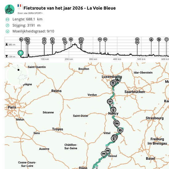 La Voie Bleue loopt van de Luxemburgse grens (Apach) tot aan Lyon in Frankrijk. De 727 kilometer lange fietsroute volgt grotendeels de rivieren de Moezel en de Saône en loopt langs het Canal des Vosges. De realisatie duurde door covid langer dan gepland, en op enkele plekken maakten natuurbeschermingsregels de aanleg van fietspaden op het jaagpad lastig. Toch ligt er nu een prachtige route die Frankrijk op zijn mooist laat zien.