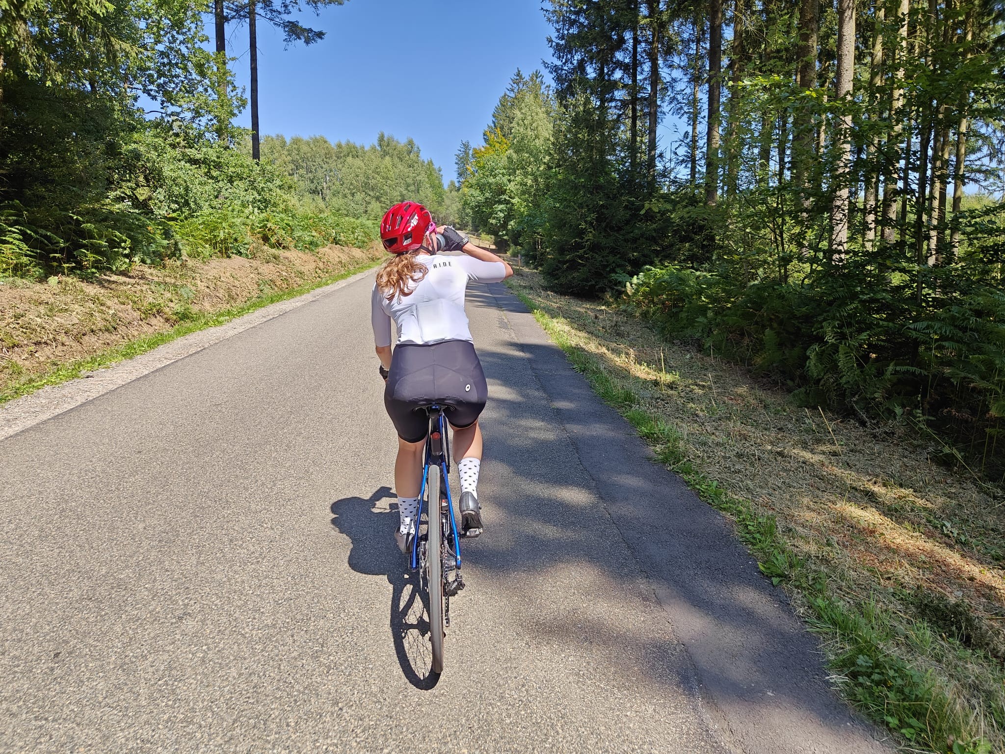 Ze kozen voor de ‘Out Of Office’-route: een groene, heuvelachtige tocht met verrassend goed berijdbare wegen. Rond de middag vertrokken ze, goed voorbereid met twee bidons isotonische sportdrank, twee haverrepen, twee gewone gellekes en een powergel. Voor Karin was dat laatste een primeur. Zo’n geconcentreerd gelletje had ze nog nooit geprobeerd. Spannend dus, maar gelukkig verliep alles vlot.