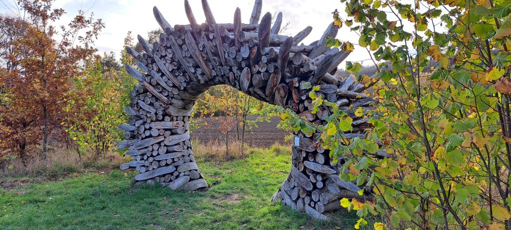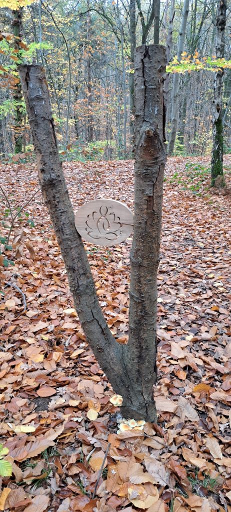 Uiteraard moesten ze dit uittesten. Na een tocht door het labyrint zette ze hun wandeling verder en kwamen ze uit op een kunstwerk gemaakt in hout. Ideaal voor een groepsfoto. Ze hebben allen genoten van deze prachtige herstwandeling in het mooie Linden- en Chartreuzenbos.