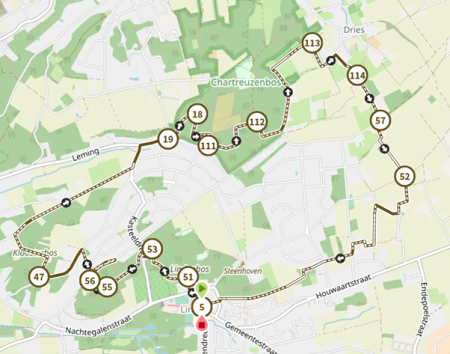 Startplaats: Sint-Kwintenkerk, Martelarenplaats 1, 3210 Linden (Lubbeek). Er is een grote, gratise parking beschikbaar. Kom je met het openbaar vervoer? Neem dan de trein tot Leuven en vervolgens bus 44 tot bushalte “Linden kerk”. Deze ligt op 170 meter van de startplaats.